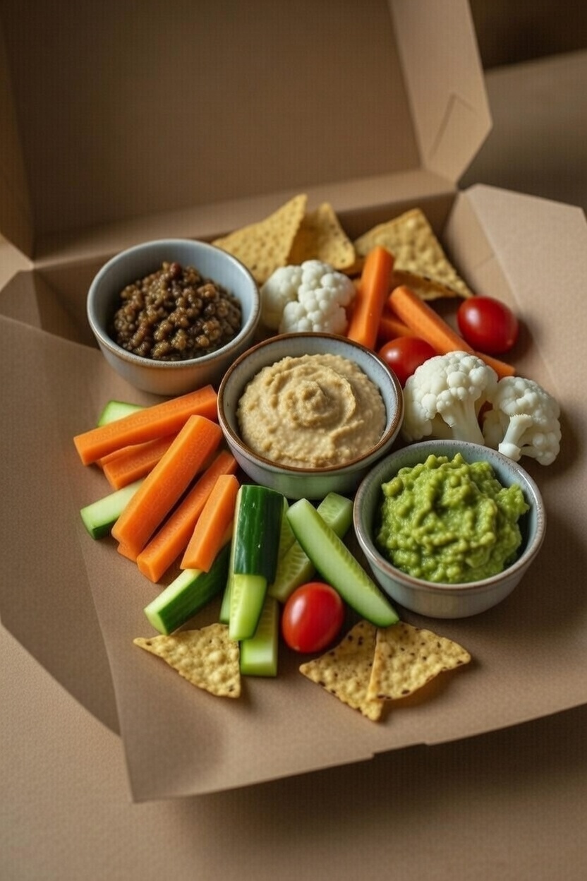 Petits légumes croquants et ses sauces (houmous, guacamole, tapenade) accompagné de chips mexicains – Frais et goûtu!