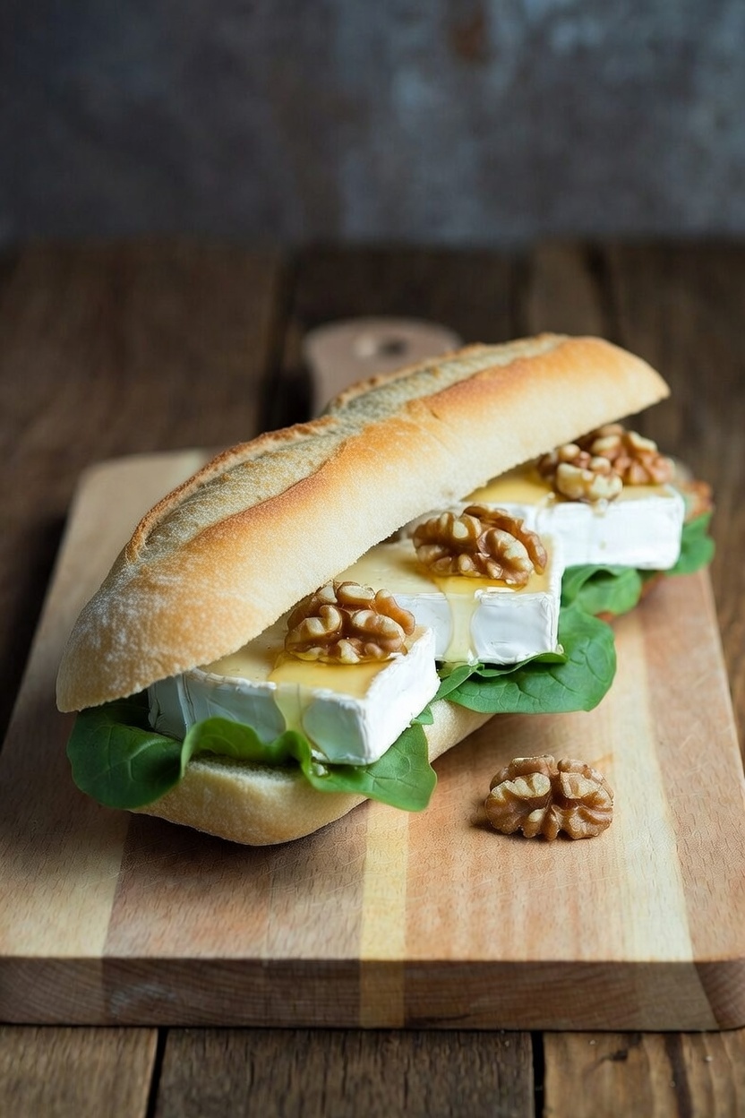 Pain baguette, brie, salade, noix, miel